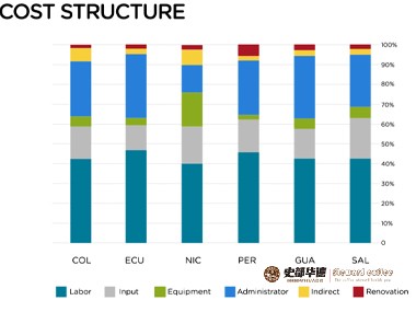 哥伦比亚:大约三分之一的成本用于行政管理,另外三分之一用于收获期劳动力,这意味着劳动力短缺或工人权利的改变可能会在这里产生重大影响。装修费用略低于平均水平。